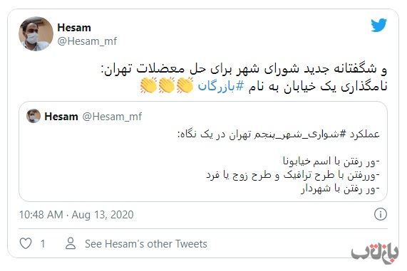 در مورد اقدام اخیر یعنی نامگذاری یک خیابان به نام مهندس بازرگان نیز فارغ از اعتراض هایی که جنس سیاسی دارد، برخی کابران شبکه های مجازی اعضای شورای شهر را بخاطر تمرکز بیش از حد روی مسئله تغییر نام خیابان ها شماتت کرده و با حالت طنز آنها را درگیر و مشغول بازی اسم فامیل معرفی کرده اند.