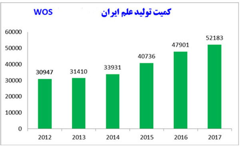 وی اظهار داشت: با توجه به آمار ثبت شده در پایگاه استنادی بین المللی WoS میزان تولید علم ایران در سال های ۲۰۱۳، ۲۰۱۴، ۲۰۱۵، ۲۰۱۶ و ۲۰۱۷ میلادی به ترتیب ۳۰۹۴۷، ۳۱۴۱۰، ۳۳۹۳۱، ۴۰۷۳۶، ۴۷۹۰۱ و ۵۲۱۸۳ بوده است. به این ترتیب میزان تولید علم کشور از ۳۰۹۴۷ در سال ۲۰۱۲ به ۵۲۱۸۳ در سال ۲۰۱۷ یعنی بیش از ۱.۶ برابر افزایش یافته است.