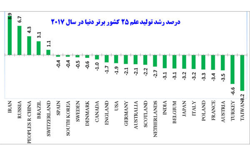 آخرین اطلاعات مستخرج از یک پایگاه استنادی بین المللی نشان می دهد بر اساس آمار رشد تولید علم در سال ۲۰۱۷، جمهوری اسلامی ایران در بین ۲۵ کشور برتر دنیا رتبه نخست دنیا را دارد.