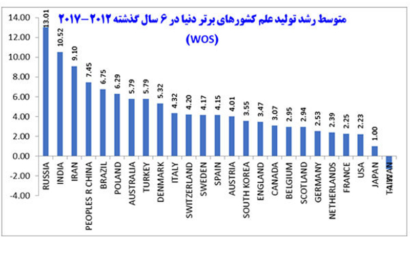 وی گفت: بعد از ایران، کشور روسیه با ۶.۷ درصد بیشترین رشد کمیت علم دنیا را داشته است. چین با ۴.۳ درصد در رتبه سوم و برزیل و سوئیس هرکدام به ترتیب با ۳.۱ درصد و ۱.۱ درصد در رتبه های بعدی قرار گرفته اند. برخی از کشورها در سال ۲۰۱۷ دارای رشد منفی هستند یعنی مدارک ثبت شده آنها در سال ۲۰۱۷ از سال قبل کمتر بوده است.