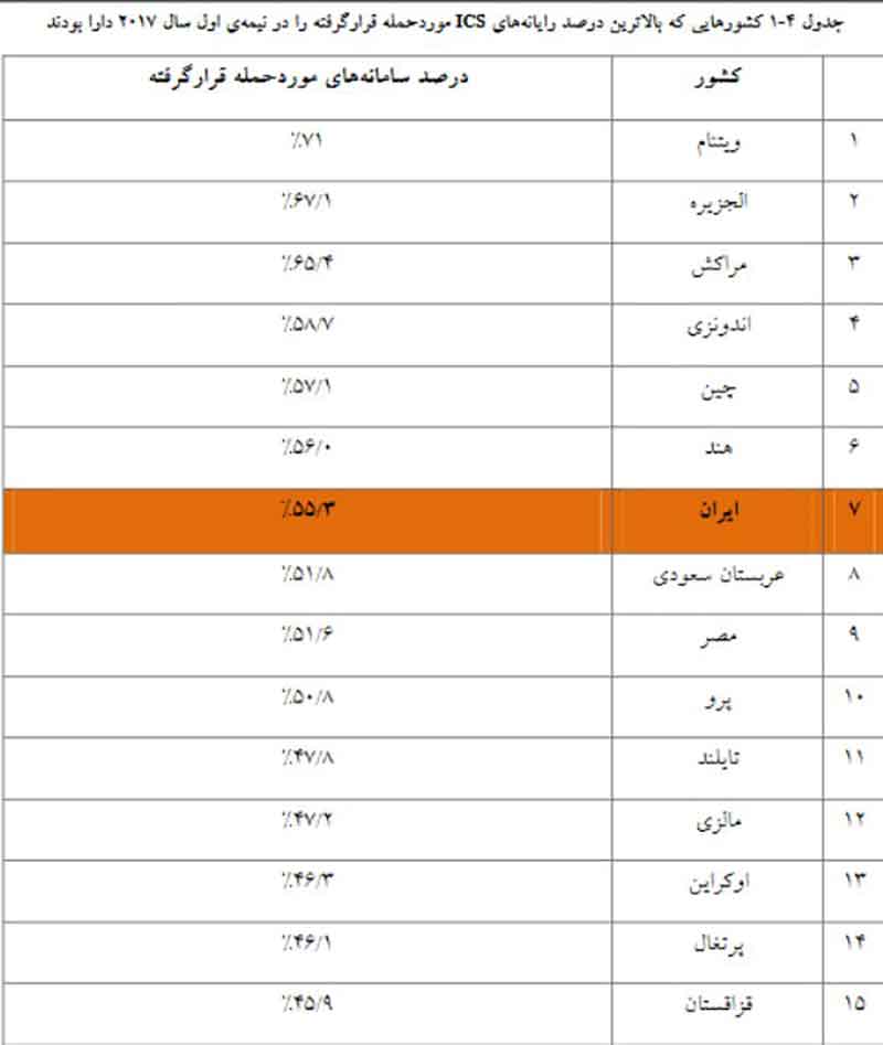 نتایج به دست آمده از تهدیدات سامانههای کنترل صنعتی در ۶ماهه اول سال ۲۰۱۷ نشان می دهد که ایران در میان ۱۰ کشور اولی است که سامانه های کنترل صنعتی آن به دلیل تهدیدات سایبری، آلوده شده اند.