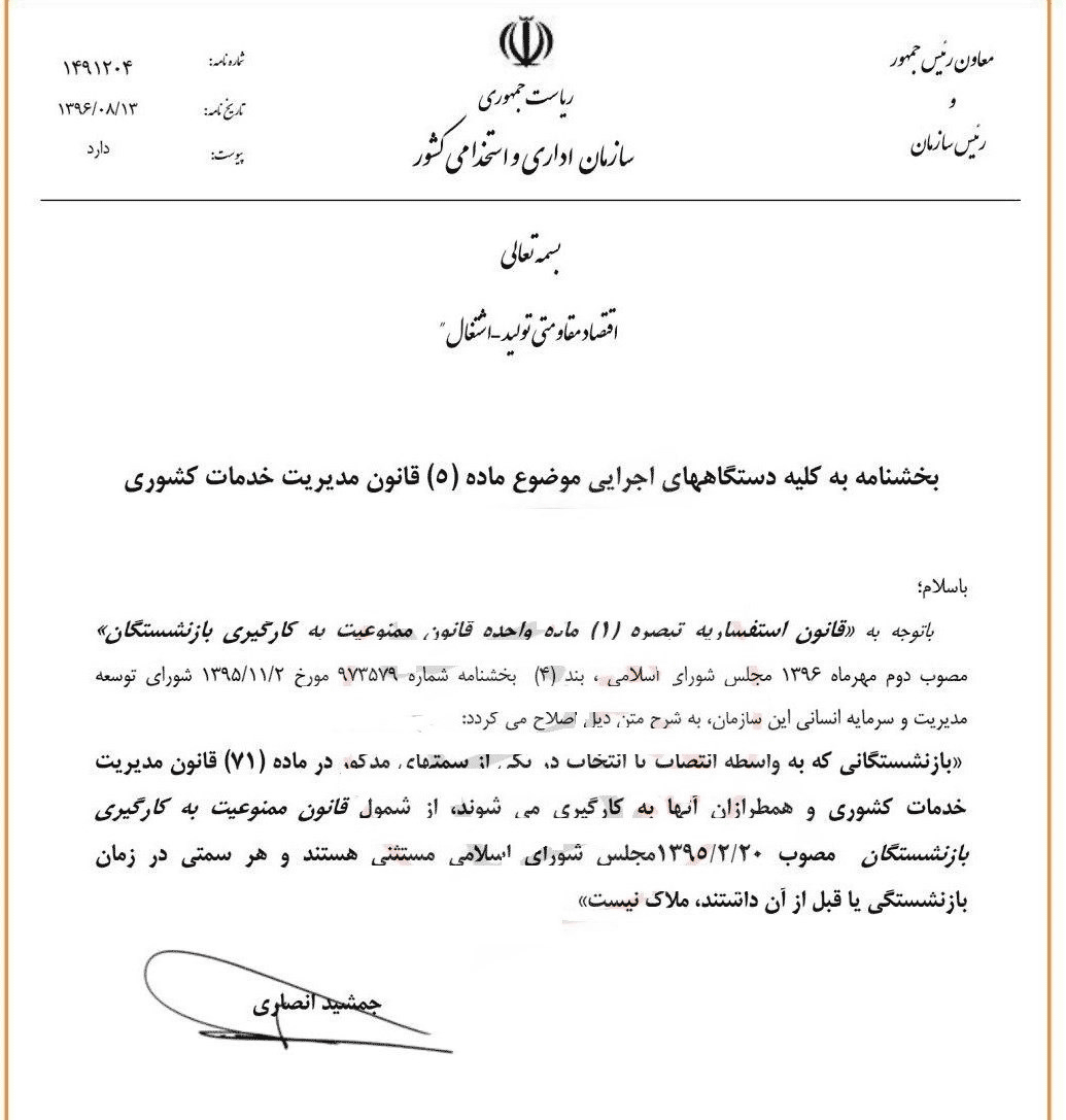 بر اساس بخشنامه سازمان اداری استخدامی، وزرا و معاونان آنها از قانون منع به کارگیری بازنشستگان مستثنی شدند.