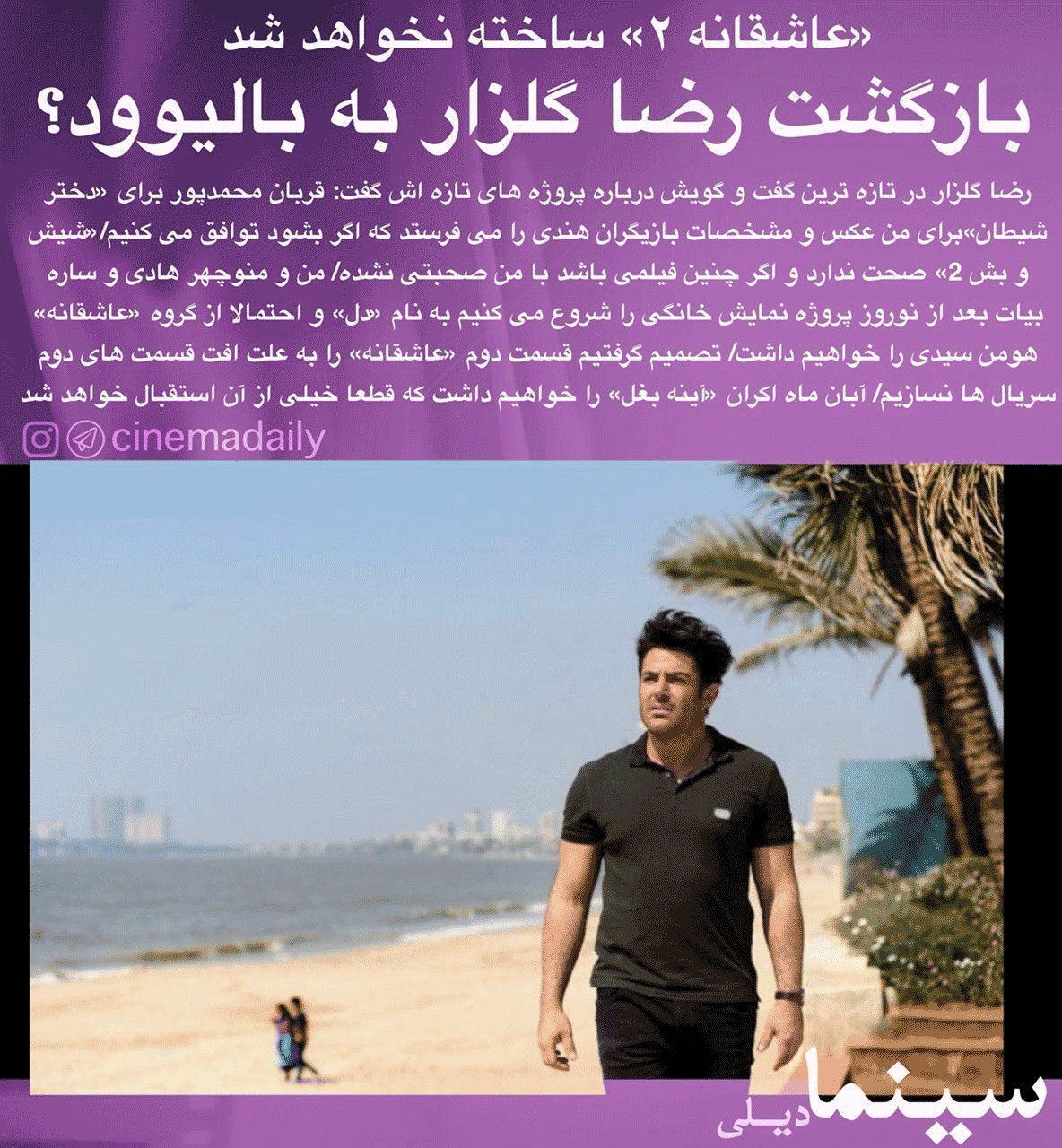 رضا گلزار: با منوچهر هادی و ساره بیات «دل» رابرای شبکه خانگی می سازیم.«عاشقانه۲» به علت افت قسمت دوم سریالها ساخته نخواهد شد.در جریان«دختر شیطان» هستم واگر بشود برای این فیلم توافق میکنیم.
