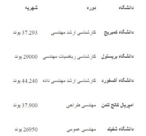 دانشجویان بینالمللی پس از پذیرش در دانشگاههای انگلیس باید انتظار شهریهای بین ۲۰ هزار تا ۳۰ هزار پوند در سال را داشته باشند. اغلب رشتههای مهندسی در مقطع کارشناسی ارشد حتی تا ۴۵ هزار یورو هم باید پرداخت کنند. جدول زیر نگاهی اجمالی به هزینه رشتههای مهندسی در مهمترین دانشگاههای کشور انگلیس انداخته است: