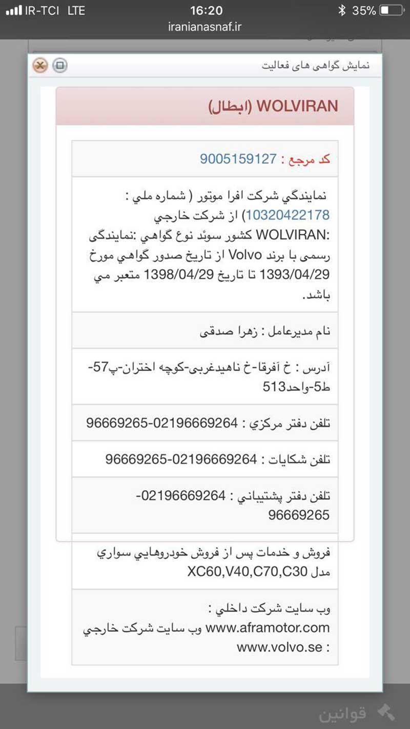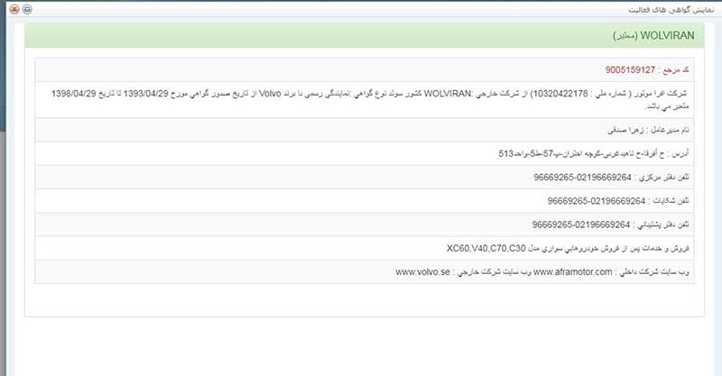 در این مجوز ذکر شده:”نمایندگی شرکت افراموتور از شرکت خارجی Wolviran کشور سوئد نمایندگی رسمی با برند ولوو از تاریخ صدور گواهی مورخ ۲۹/۴/۱۳۹۳ تا تاریخ ۲۹/۰۴/۱۳۹۸ است.” در این متن دو نکته مهم وجود دارد. نکته اول این است که شرکت ولویران(Wolviran) که شرکت افراموتور نماینده آن در ایران است، شرکتی که متعلق به خود مسعود بصروی(مالک افراموتور) می باشد. در اسناد موجود از شرکت ولویران به صراحت اسامی مسعود بصروی و علیرضا رضایی به عنوان اعضای اصلی و گردانندگان شرکت ولویران دیده می شود.