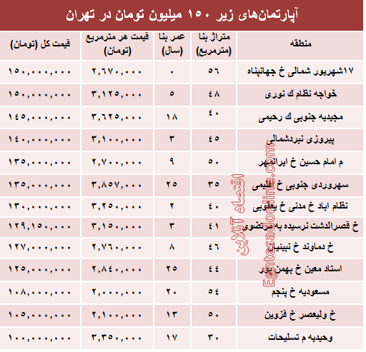 آنچه در زیر میآید جدول قیمت معاملات انجام شده آپارتمانهایی در مناطق مختلف شهری تهران طی خرداد ماه ۹۶ است که می توان با ۱۵۰ میلیون تومان خرید.لازم به ذکراست که این ارقام مربوط به اعلام سامانه اطلاعات بازار املاک ایران می باشد: