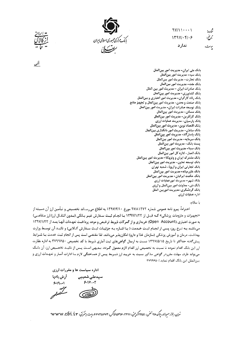 به گزارش مهر، طبق بخشنامه جدید بانک مرکزی، تخصیص و تامین ارز آن دسته از «تجهیزات و ملزومات پزشکی» که قبل از ۲۲ فروردین ماه امسال با انجام ثبت سفارش غیر بانکی (بدون انتقال ارز/ارز متقاضی) به صورت اعتباری خریداری و از گمرکات ذیربط ترخیص و موعد پرداخت تعهدات آنها بعد از تاریخ مذکور است به نرخ روز، پس از انجام ثبت خدمت و تایید وزارت بهداشت، درمان و آموزش پزشکی امکان پذیر شد.