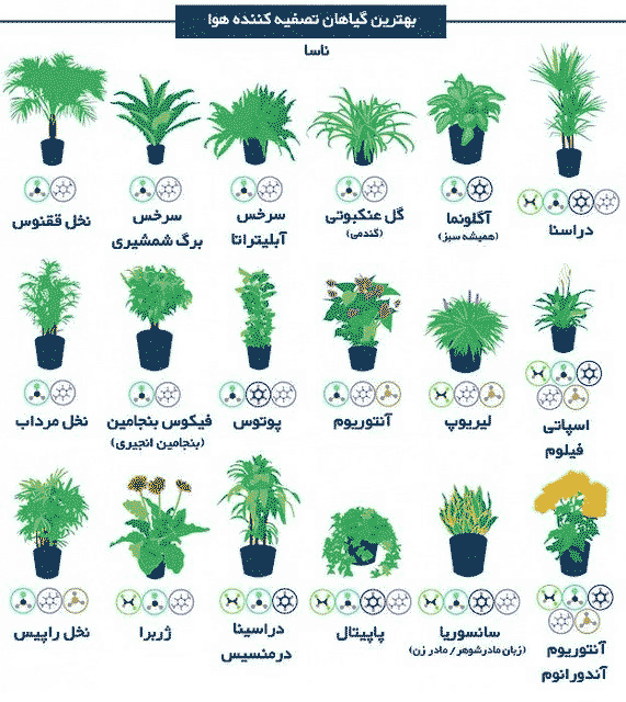سازمان فضایی ناسا در مطالعهای به بررسی تاثیرگذاری برخی انواع گیاهان در تصفیه هوای محیطهای بسته پرداخته است.