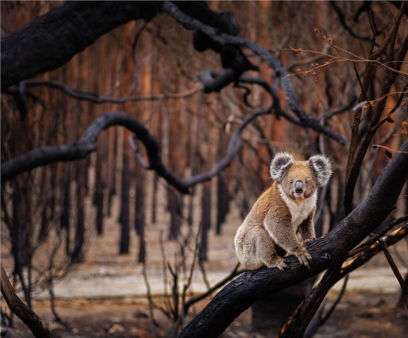 یک کوالا نشسته روی یک درخت سوخته بر اثر آتش سوزی در استرالیا/ عکس از Julie Fletcher