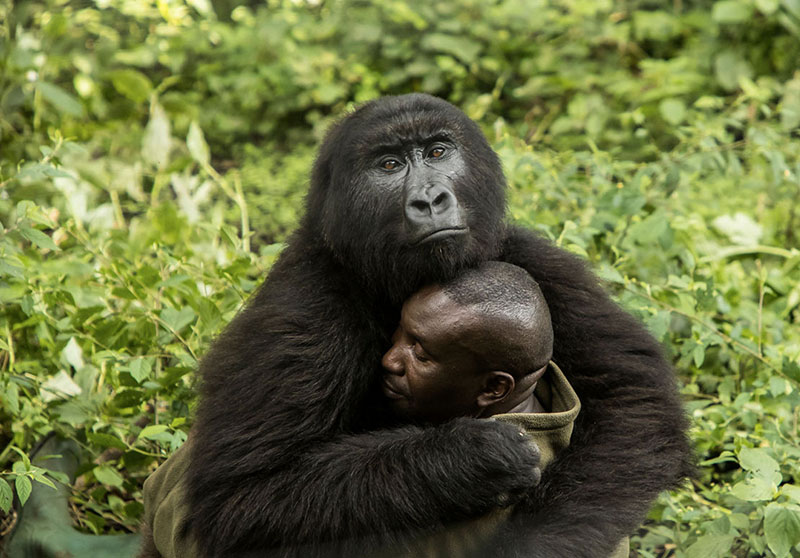 یک مرد در آغوش گوریل غول پیکر در پارک ملی ویرونگا کشور کنگو/ عکس از James Gifford