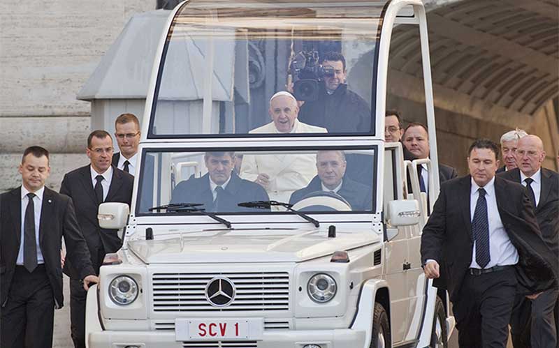 خورخه ماریو برگولیو، پس از برگزیده شدن بهعنوان دویست و شصت و ششمین پاپ، خودروهای مورد استفادهی پاپ بندیکت شانزدهم را مرخص نکرد. خودروهای مورد استفادهی پاپ چند مدل است؛ از فولکس واگن فیتون تا فورد فوکوس (نسل دوم) و رنو ۴ مدل ۱۹۸۴. اما معروفترین خودروی پاپ، انواع پاپموبیلها با شیشهها و سقف بلند صندلی عقب آن است. پاپموبیلهای فعلی پاپ، شامل مرسدس بنز G500 و M500، فیات 500L و مدلهای ویژه برای سفرهای خارجی است. درصورت سفر پاپ به سفر خارجی و انتقال ندادن پاپموبیل، خودروی زرهی پیشنهادی مقامات کشور مقصد پس از بررسیهای دقیق گارد سوئیس، در اختیار مهمترین شخصیت شهر واتیکان قرار میگیرد.
