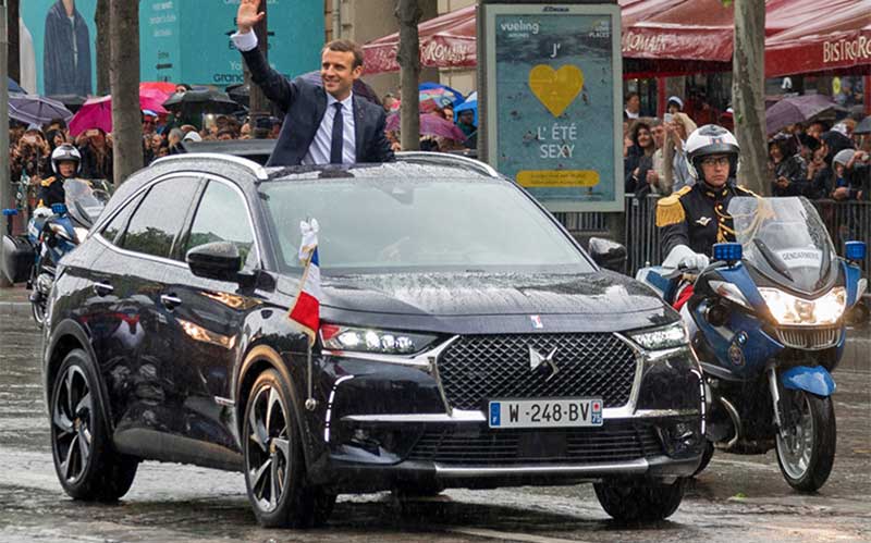 رئیس جمهور ۴۰ سالهی فرانسویها، از اولین محصول کاملاً داخلی برند لوکس DS، زیرمجموعهی گروه PSA یا پژو سیتروئن سابق استفاده میکند. برخلاف خودروهای مقامات سیاسی دیگر کشورهای بزرگ، DS7 کراسبک مکرون استاندارد بهنظر میرسد؛ رنگ آبی تیره، سقف پانورامیک، نشان جمهوری روی بدنه و رینگهای ۲۰ اینچ تنها موارد قابل تشخیص این مدل هستند. ادوار فیلیپ نخست وزیر فرانسه، معمولاً از رنو اسپس (Espace) و در سفرهای مهم با دستیارهای خود، از فولکس واگن مولتیون استفاده میکند.