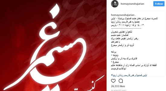 همایون شجریان، خواننده موسیقی اصیل ایرانی با انتشار پُستی در صفحه اینستاگرامش از حضور خود به همراه گروه کُر و ارکستر سیمرغ در بخش جنبی فستیوال پرشیانا خبر داد و نوشت: «کنسرت سیمرغ در بخش جنبى فستیوال پرشیانا – اولین جشنواره هنر فارسیزبانان اروپا ۱۳، ۱۴ و ۱۵ ژانویه ۲۰۱۸ – پاریس (شنبه ۲۳، یکشنبه ۲۴ و دوشنبه ۲۵دی ۱۳۹۶)