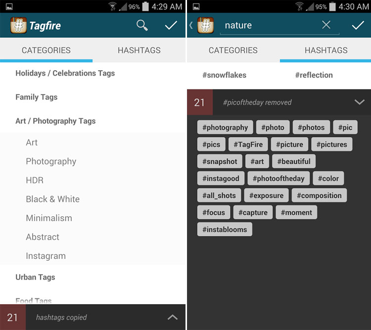 TagFire اپلیکیشنی بسیار جالب برای گوشی‌های اندروید است که به کمک آن به مجموعه‌ای از هشتگ‌های آماده و از قبل نوشته‌شده در دسته‌بندی‌های مختلف دسترسی خواهید داشت. کافی است برای مثال به دسته‌بندی Animals بروید و حیوان مورد نظر خود را انتخاب کنید تا با مجموعه‌ای از هشتگ‌های مختلف و مرتبط به آن حیوان رو‌به‌رو شوید. حال تنها کاری که باید انجام دهید، کپی کردن این هشتگ‌های آماده و پیست کردن آن‌ها در اینستاگرام یا هر مکان دیگری است که مایل هستید تا به همین راحتی نیاز شما به هشتگ بدون هیچ‌گونه زحمتی برطرف شود. نکته‌ی مثبتی که در این برنامه وجود دارد، نمایش و امکان کپی یکجای تمام هشتگ‌ها است؛ به این معنا که با لمس گزینه‌ی Copy در بخش پایینی هر دسته، می‌توانید تمام هشتگ‌های نمایش داده‌شده را یکجا کپی کنید. این برنامه تنها از زبان انگلیسی پشتیبانی می‌کند و در زمینه‌ی هشتگ‌های فارسی کمکی به کاربر نخواهد کرد. البته این موضوع را نمی‌توان صرفا یک ایراد دانست؛ زیرا می‌توان از این زاویه نیز به موضوع نگاه کرد که هشتگ‌های فارسی توسط هر کاربری قابل نوشتن خواهند بود و این هشتگ‌های انگلیسی هستند که به دلیل کم بودن دانش اکثر کاربران از زبان انگلیسی، به یک همراه و کمک نیاز خواهد داشت. برای دانلود برنامه اندروید TagFire می‌توانید از لینک زیر استفاده کنید.