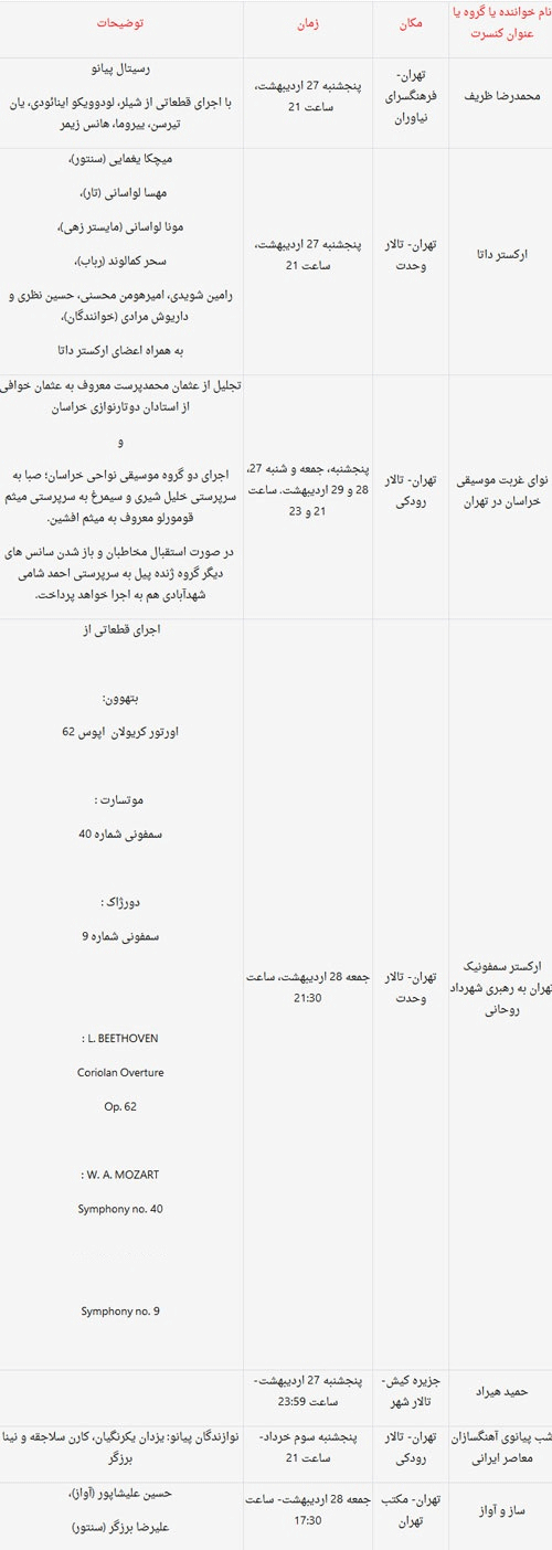 شروع ماه مبارک رمضان سال ۱۴۳۹ هجری قمری از امروز، پنجشنبه ۲۷ اردیبهشت است و پایان احتمالی آن پنجشنبه ۲۴ خرداد، در این ۲۹ روز، برگزاری کنسرت یا اساسا دست نمیدهد یا بسیار کمرنگ است. طبق آنچه در جدول زیر میبینید محمدرضا ظریف، ارکستر داتا، دو گروه موسیقی نواحی خراسان؛ صبا به سرپرستی خلیل شیری و سیمرغ به سرپرستی میثم قومورلو معروف به میثم افشین در قالب نوای غربت موسیقی خراسان در تهران، ارکستر سمفونیک تهران، یزدان یکرنگیان، کارن سلاجقه و نینا برزگر در قالب شب پیانوی آهنگسازان معاصر ایرانی، حسین علیشاپور و علیرضا برزگر در قالب ساز و آواز در مکتب تهران و حمید هیراد تنها کسانی هستند که در رمضان ۹۷ اجرا خواهند داشت.