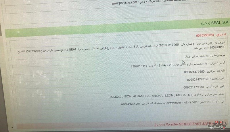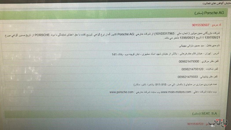 ۲- اعطای مجوز واردات ۱ ساله به “شرکت بازرگانی معین موتور” از شرکت Porsche AG کشور آلمان نوع گواهی: توزیع کننده با حق اعطای نمایندگی با برند Porsche از تاریخ صدور گواهی مورخ ۱۳۹۷/۸/۲۱ تا تاریخ ۱۳۹۸/۸/۲۱