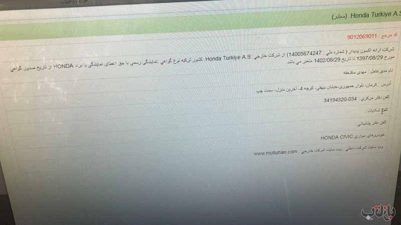 ۳- اعطای مجوز واردات ۵ ساله به “شرکت ارابه اکسون پدیدار” از شرکت Honda Turkiye A.S کشور ترکیه نوع گواهی : نمایندگی رسمی با حق اعطای نمایندگی برند Honda از تاریخ صدور گواهی مورخ ۱۳۹۷/۸/۲۹ تا تاریخ ۱۴۰۲/۸/۲۹