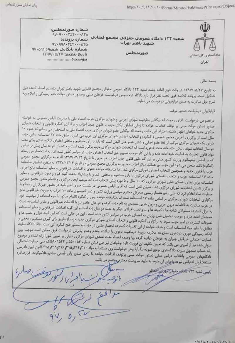 همچنین تصویر حکم صادره از سوی اجرای احکام شعبه ۱۲۳ دادگاه عمومی حقوقی مجتمع قضایی شهید باهنر تهران نیز نشان می دهد، در نامه ای که به مهر دادگستری استان تهران مهمور و خطاب به معاون سیاسی وزیر کشور و کمیسیون ماده ۱۰ قانون فعالیت احزاب صادر شده، «رحمت الله بیگدلی» مطابق با ادعای خود، دستور موقت پیرامون فعالیت های ترکیب جدید حزب اعتماد ملی گرفته است.