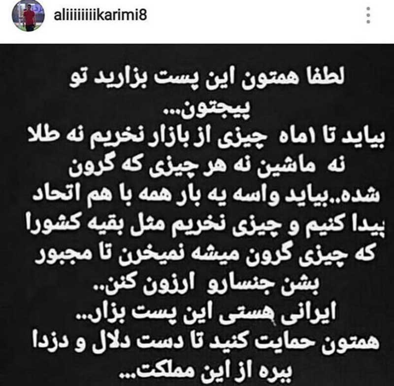 علی کریمی بازیکن سابق تیم ملی فوتبال کشورمان با انتشار پستی در صفحه شخصی خود در اینستا گرم از مردم درخواست کرد تا به مدت یک ماه خودرو، طلا و هر چیز گرانی که در بازار فروخته میشود را تحریم کنند و نخرند تا این حباب افزایش قیمت که عده ای سودجو به وجود آورده اند از بین برود.
