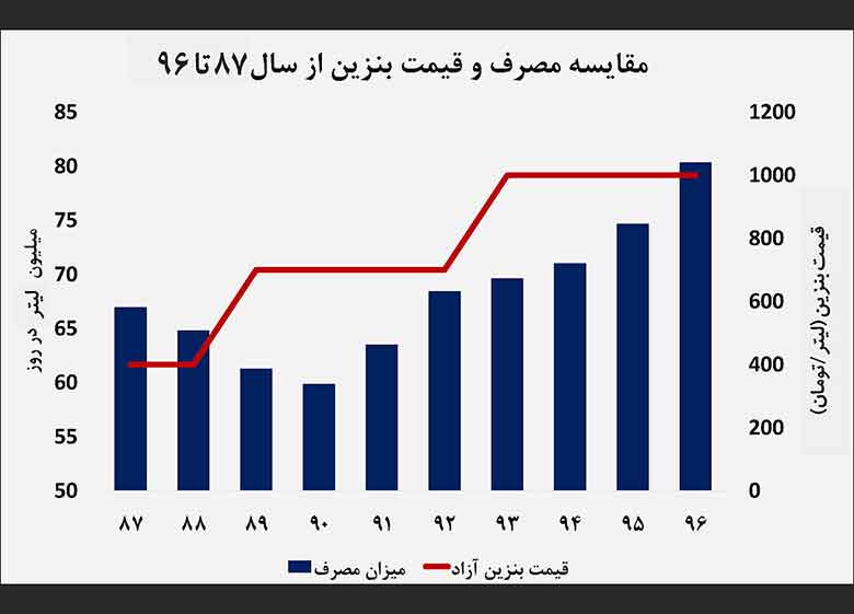 با ثابت ماندن قیمت بنزین در سال ۹۲ میزان مصرف این سوخت حدود ۷ درصد رشد کرده و به ۶/ ۶۷ میلیون لیتر در روز میرسد. در سال ۹۳ با وجود اینکه قیمت بنزین افزایش یافته و هر لیتر بنزین سهمیهای ۷۰۰ تومان و بنزین آزاد ۱۰۰۰ تومان به فروش میرسد، اما همچنان شاهد رشد مصرف بودیم. در سال ۹۳ میزان مصرف ۵/ ۶۹ میلیون لیتر در روز بوده که نسبت به سال ۹۲ حدود ۳ درصد رشد داشته است.