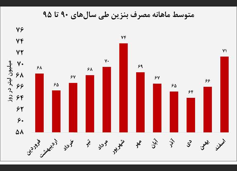 بررسی آمار ماهانه مصرف بنزین در سالهای ۹۰ تا ۹۵ نشان میدهد که میزان مصرف بنزین در شهریور بهطور متوسط حدود ۹ درصد از مصرف کل سال را به خود اختصاص میدهد. از سویی میزان مصرف بنزین در ۵ ماه ابتدای سال حدود ۴۲ درصد از کل مصرف سال است. با یک حساب ساده این برآورد به دست میآید که مصرف بنزین شهریور امسال بیشاز ۸۷ میلیون لیتر در روز برسد.