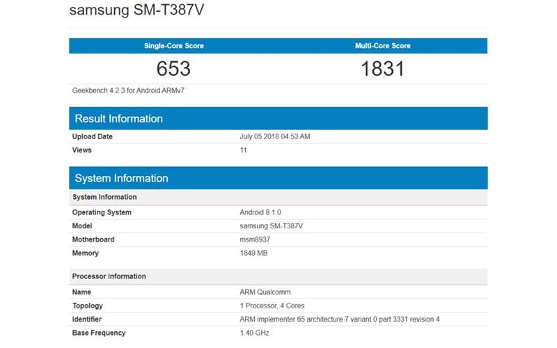 با توجه به نمرات مندرج در سایت گیک بنچ، به نظر میرسد که با تبلتی اقتصادی مواجه هستیم که از یک صفحه نمایش ۸ اینچی بهره می برد. علاوه بر این پردازندهی MSM8937 کوالکام یا همان اسنپدراگون ۴۳۰ در این گجت تعبیه شده که بیشتر برای موبایلهای اقتصادی استفاده میشود. ضمن اینکه چیپست چهار هستهای که سرعت کلاک ۱.۴ گیگاهرتزی دارد به یک رم ۲ گیگابایتی نیز مجهز شده است.