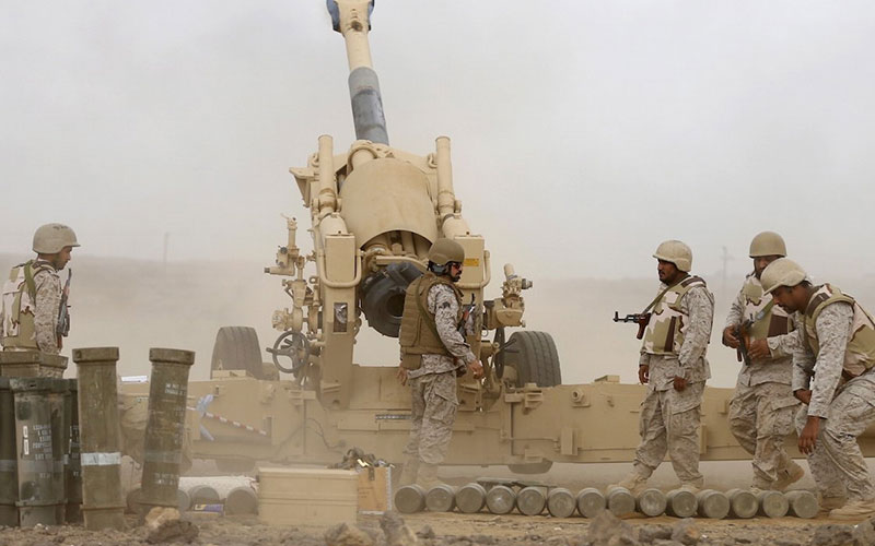واحدهای نیروی زمینی سعودی در حال گلوله باران مواضع حوثی ها در یمن