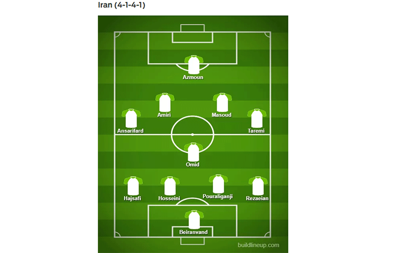 ایران: بیرانوند، پورعلی گنجی، حسینی، حاج صفی، رضاییان، ابراهیمی، انصاری فرد، طارمی، شجاعی، امیری و آزمون.