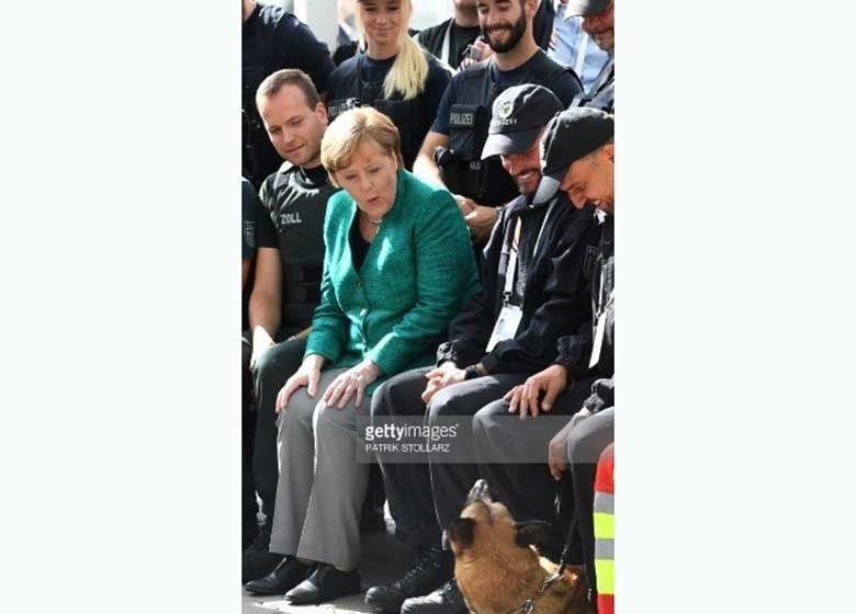 آنگلا مرکل در دیدار با گروهی از ماموران پلیس هامبورگ لحظاتی را با خطاب قرار دادن یکی از سگ‌های پلیس از او هم تشکر کرد.