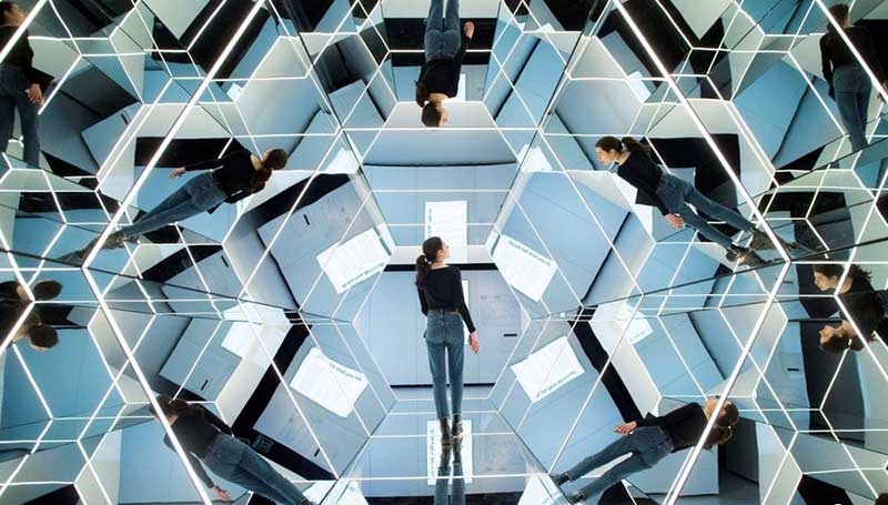 یک زن در یک نمایشگاه آینه در بارسلون اسپانیا