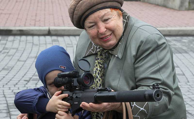 یک زن و یک کودک در نمایشگاه تجهیزات نظامی در کریمه روسیه