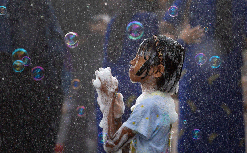 یک دختر با کف و حباب در جشنواره ای در یانگون میانمار