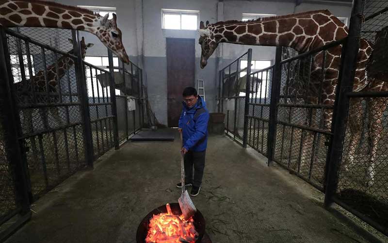 آتش روشن کردن برای گرم شدن زرافه ها در باغ وحشی در چین