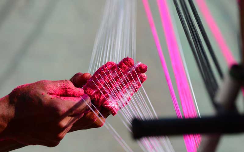 رشته های نخی در دست یک کارگر در الله آباد هند