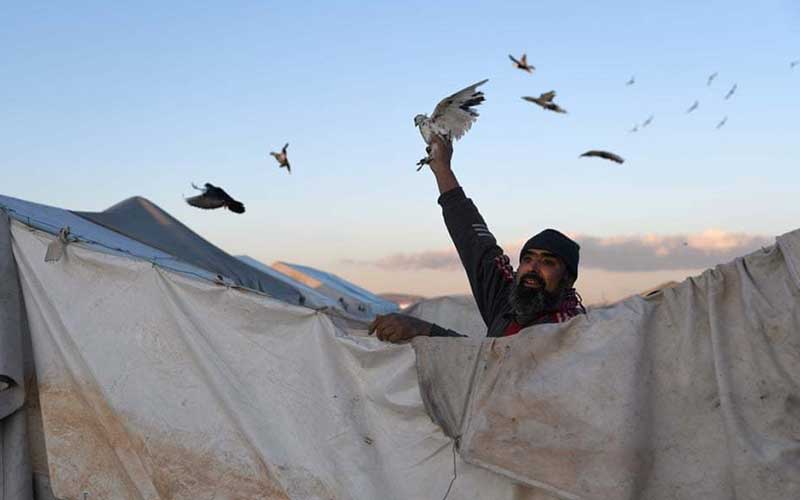 کبوتربازی یک مرد آواره سوری در اردوگاه آوارگان