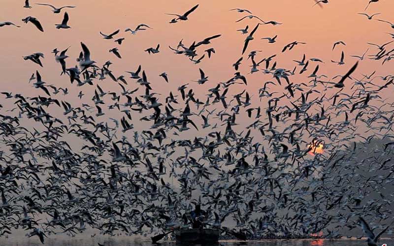 یک قایق بین صدها مرغ دریایی در رودخانه جامو هند