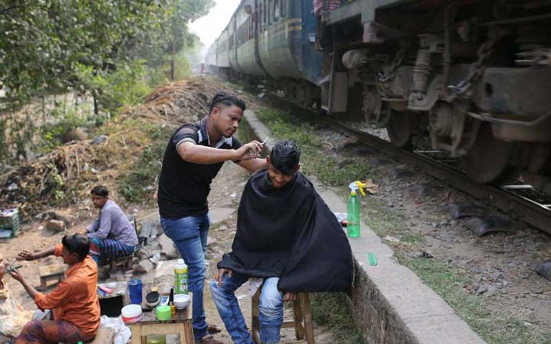 آرایشگرها در کنار ریل راه آهن در داکای بنگلادش