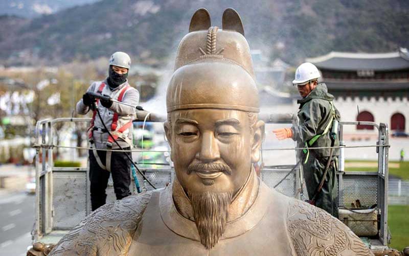 شست و شوی مجسمه غول پیکر چهارمین پادشاه سلسله چوسان در سئول کره جنوبی