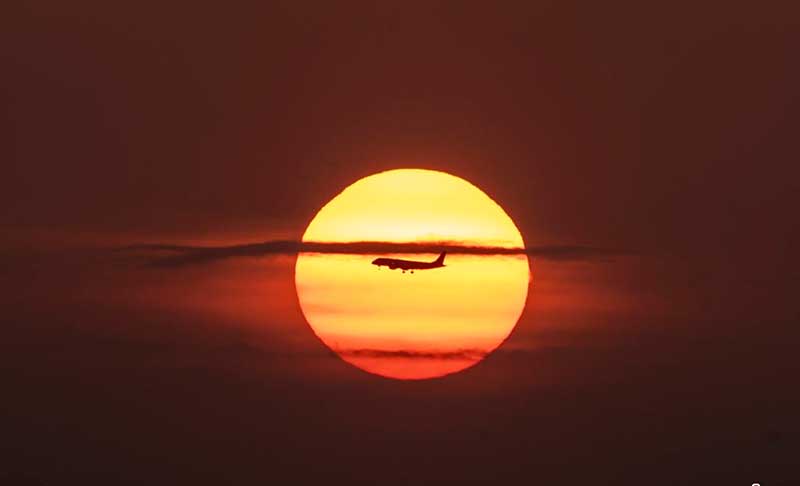 یک هواپیما مقابل خورشید در خلیج پاناما