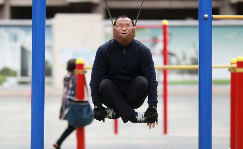 مرد آویزان شده با فک در یک مجتمع ورزشی در چین