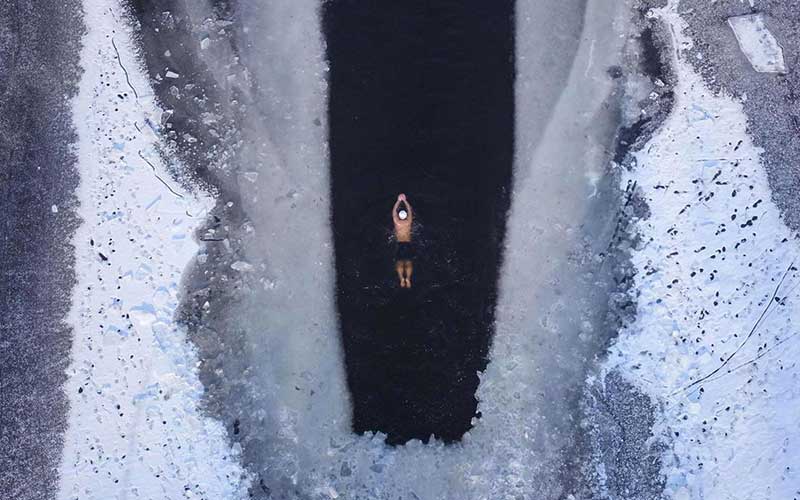 شنا در دریاچه یخ زده در لیائونینگ چین