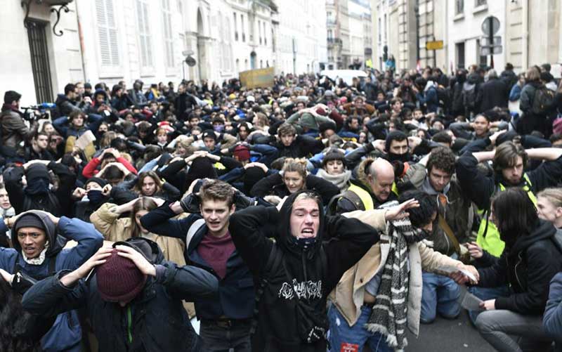 زانو زدن دانش آموزان دبیرستانی در پاریس در اعتراض به بازداشت گروهی از دانش آموزان