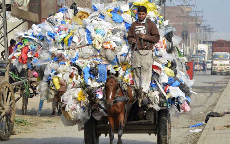 یک پسر پاکستانی در حال حمل گاری مملو از کیسه های پلاستیکی پر از زباله در لاهور