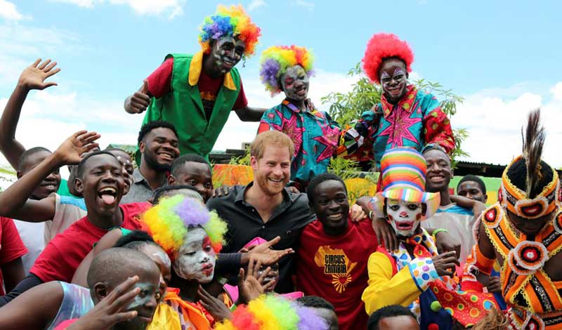 پرنس هری در میان گروهی از جوانان عضو یک سیرک در زیمباوه