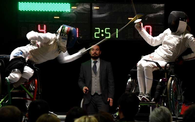 رقابت شمشیربازی روی ویلچر ورزشکار ایتالیایی با ورزشکار آمریکایی در رم