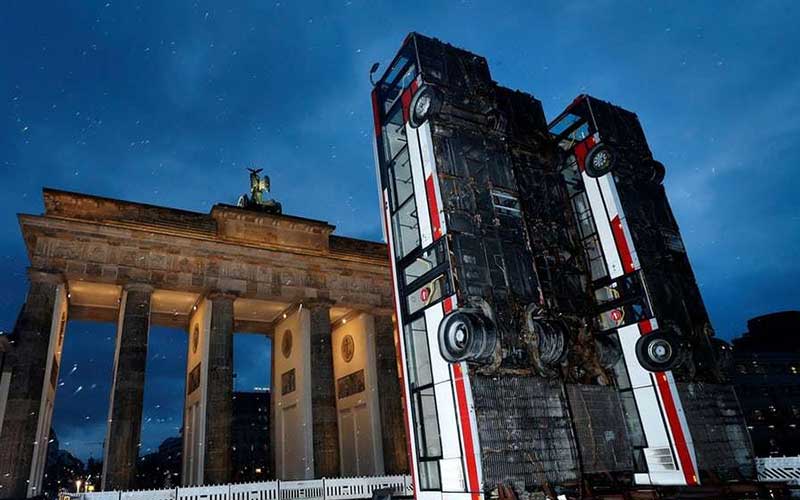 اتوبوس هایی که به یاد مردم حلب در مقابل دروازه براندنبورگ برلین قرار داده شده است