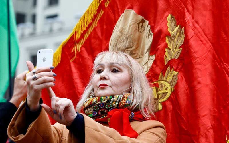 عکس سلفی یک زن با پرتره ای از ولادیمیر لنین