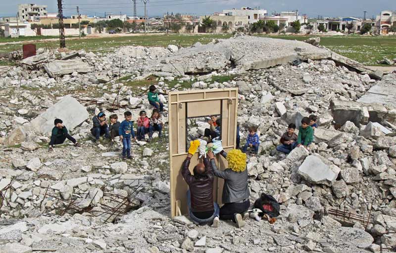 دو هنرمند سوری در حال اجرا برای کودکان در میان خرابه های ادلب