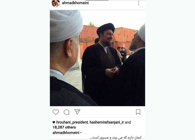 سید احمد خمینی فرزند سید حسن خمینی، با گذاشتن عکس از نگاه آیت الله هاشمی به گفتگوی صمیمانه پدرش با حسن روحانی نوشت: