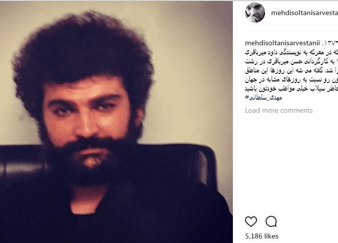 مهدی سلطانی که در سریال «شهرزاد» نقش هاشم دماوندی، پدر فرهاد را بازی می کند با انتشار عکسی از ۲۰ سال پیش خود در صفحه اینستاگرامش نوشت: «نوستالژى: سال ۱۳۷۶. تمرین نمایش «معرکه در معرکه» به نویسندگى داود میرباقرى که در تابستان ۷۶ به کارگردانى حسن میرباقرى در رشت و انزلى اجرا شد. گفته مى‌شه این روزها این مناطق بیشترین بارون رو نسبت به روزهاى مشابه در جهان داشته. به خاطر سیلاب خیلى مواظب خودتون باشید.»